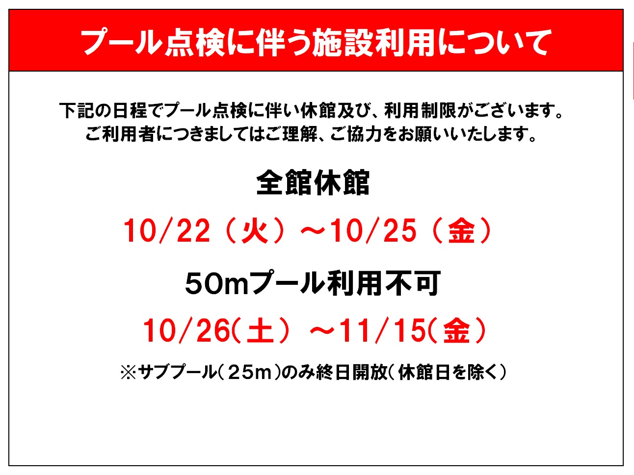 下記の日程でプール点検に伴い利用制限がございます。