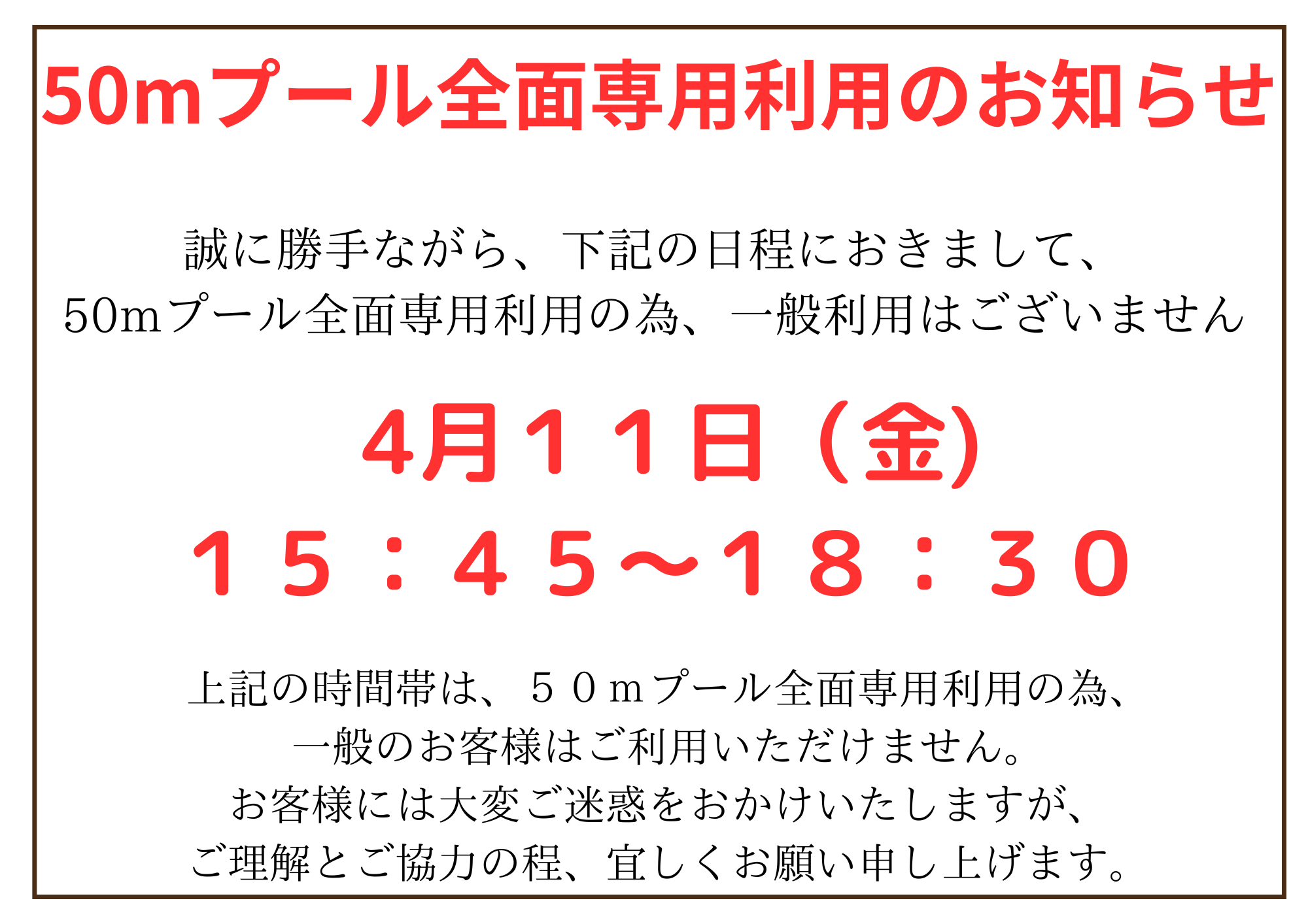 50mプール全面専用利用のお知らせ
