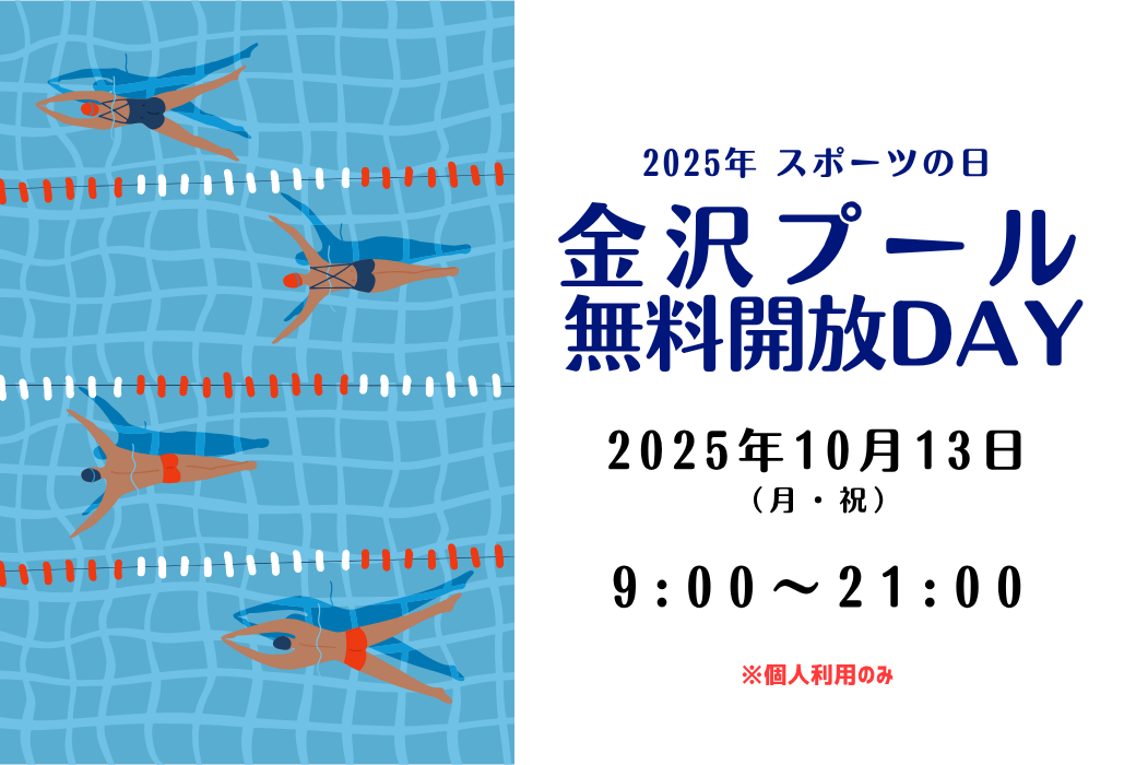 10月13日(月・祝)スポーツの日は無料開放を行います。金沢プールを無料でご利用いただけます。当日は混雑が予想されます。ご来館の際は、時間に余裕をもってお越しください。みなさんのご協力をよろしくお願いします。